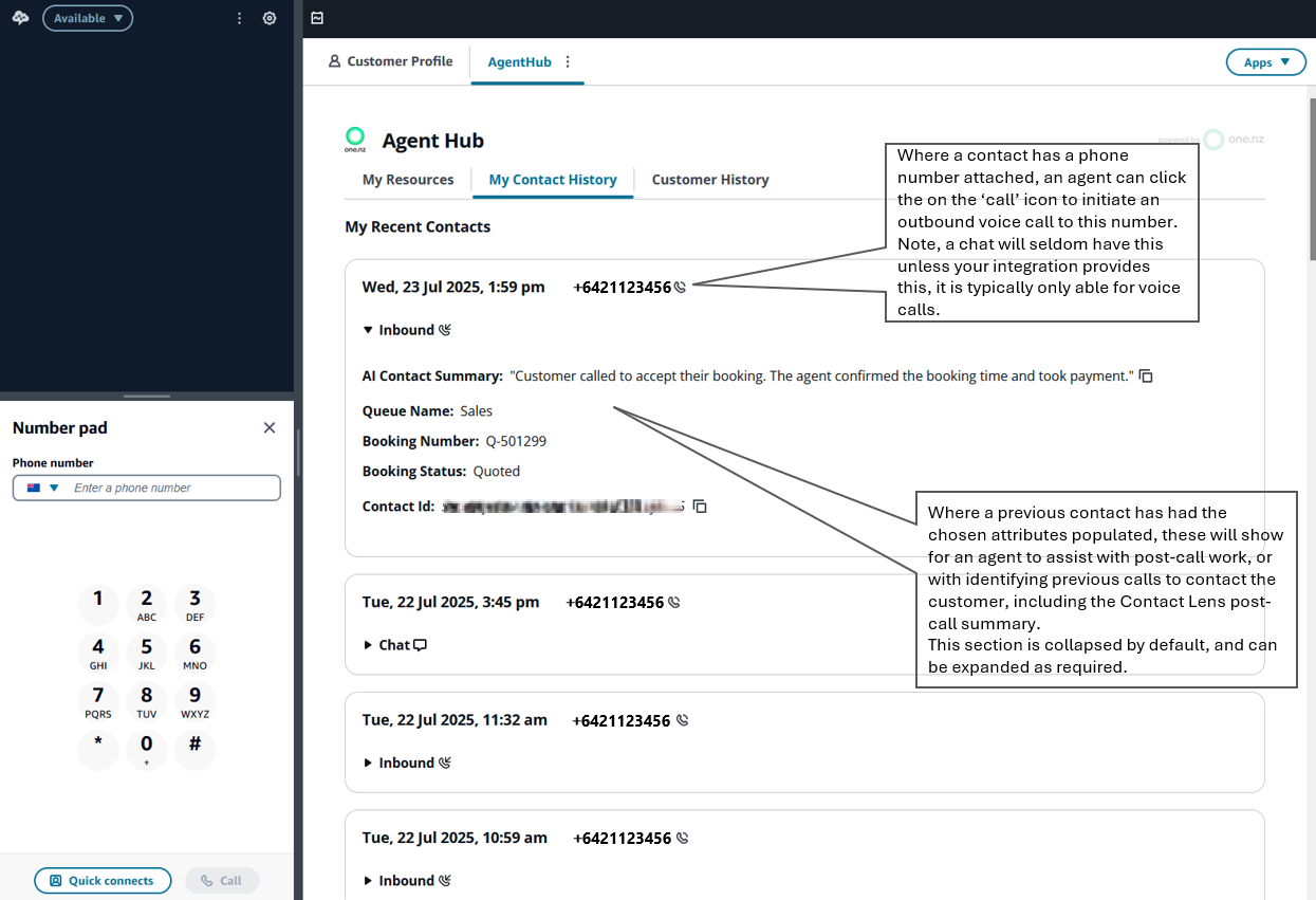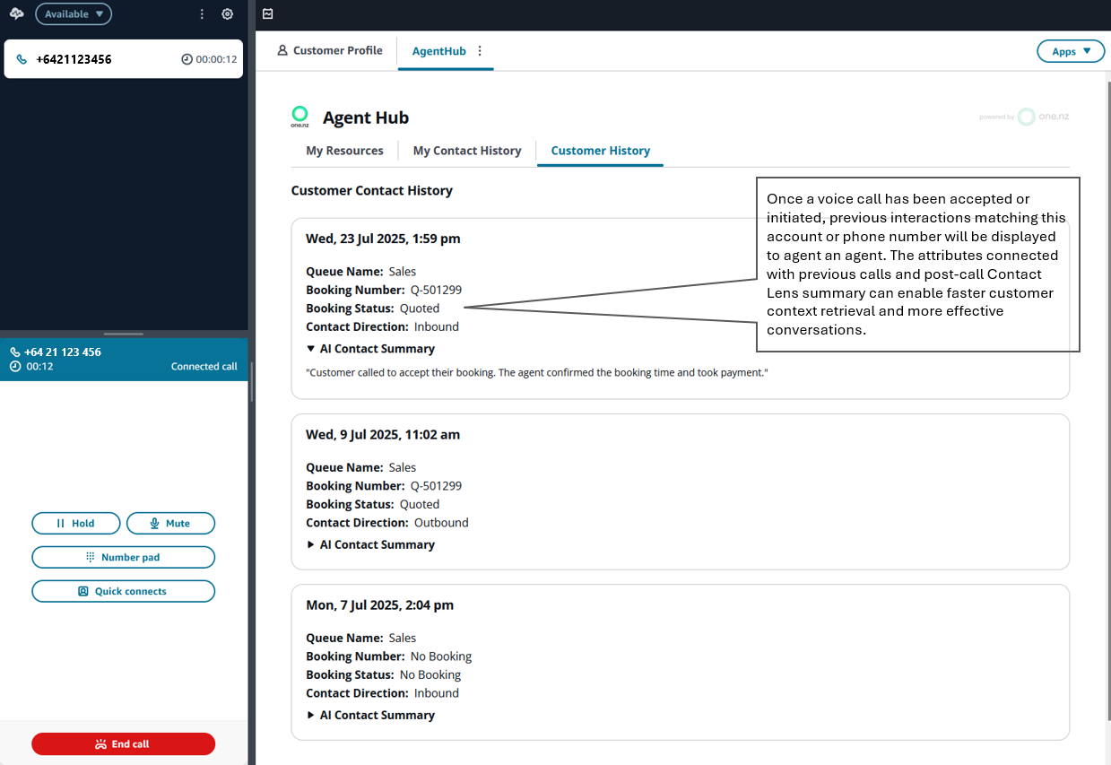 NOTE: An agent's contact history is updated on completion of the contact record being processed by Contact Lens. This can take a few minutes depending on the length of the call, call volume and other factors related to Amazon Connect.