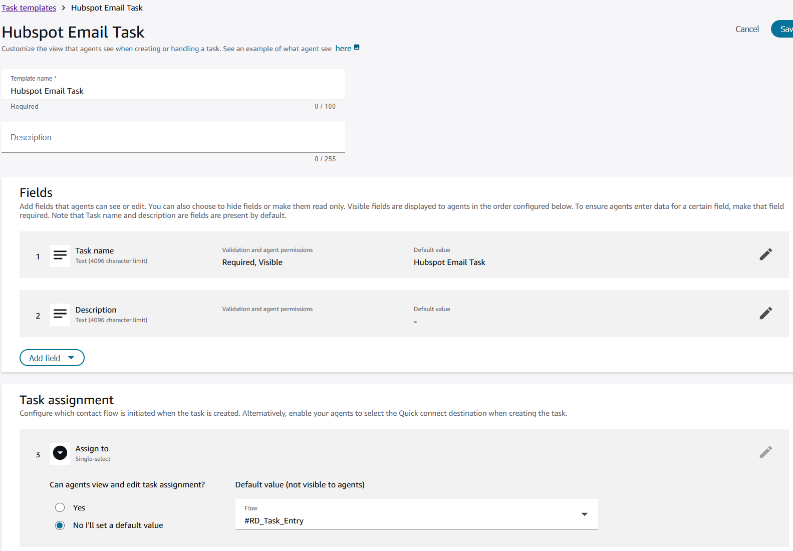 To route inbound emails to HubSpot as tasks in Amazon Connect, first create a Task Template.