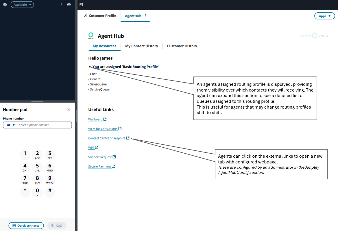 The Usage section of this guide provides some detailed views of Agent Hub working with Amazon Connect Agent Workspace.