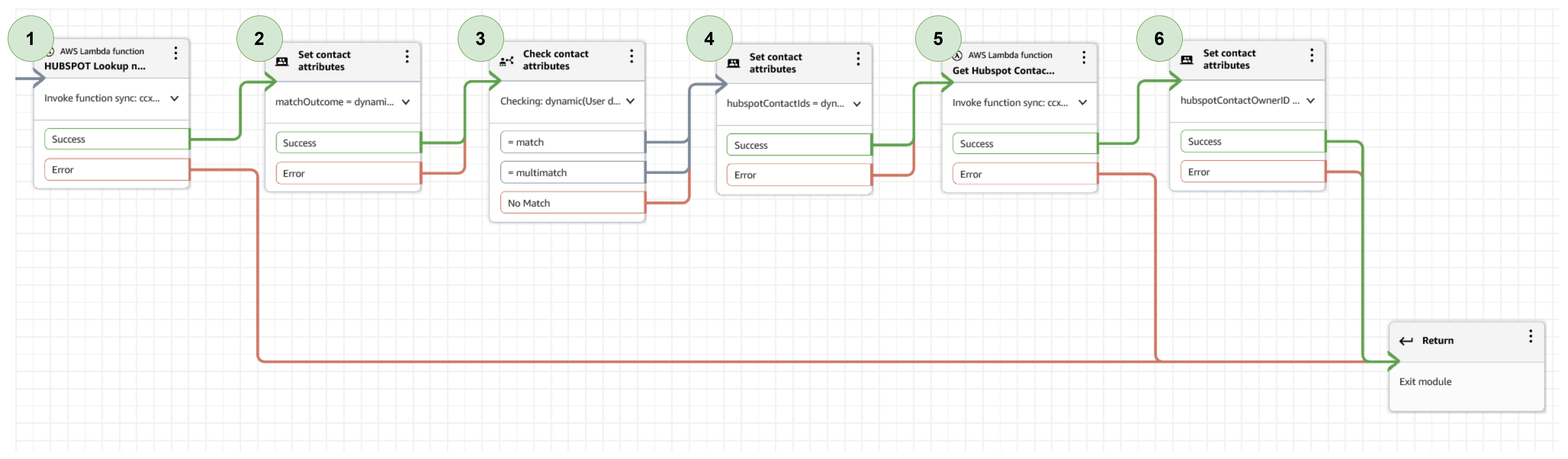 | 5 | AWS Lambda Function | hs_operation = getHSContactAttribute returnAttribute = hubspot_owner_id HubspotContactID = $.Attributes.hubspotContactIds |